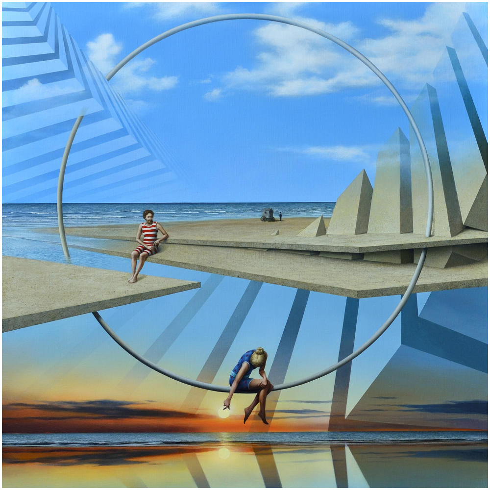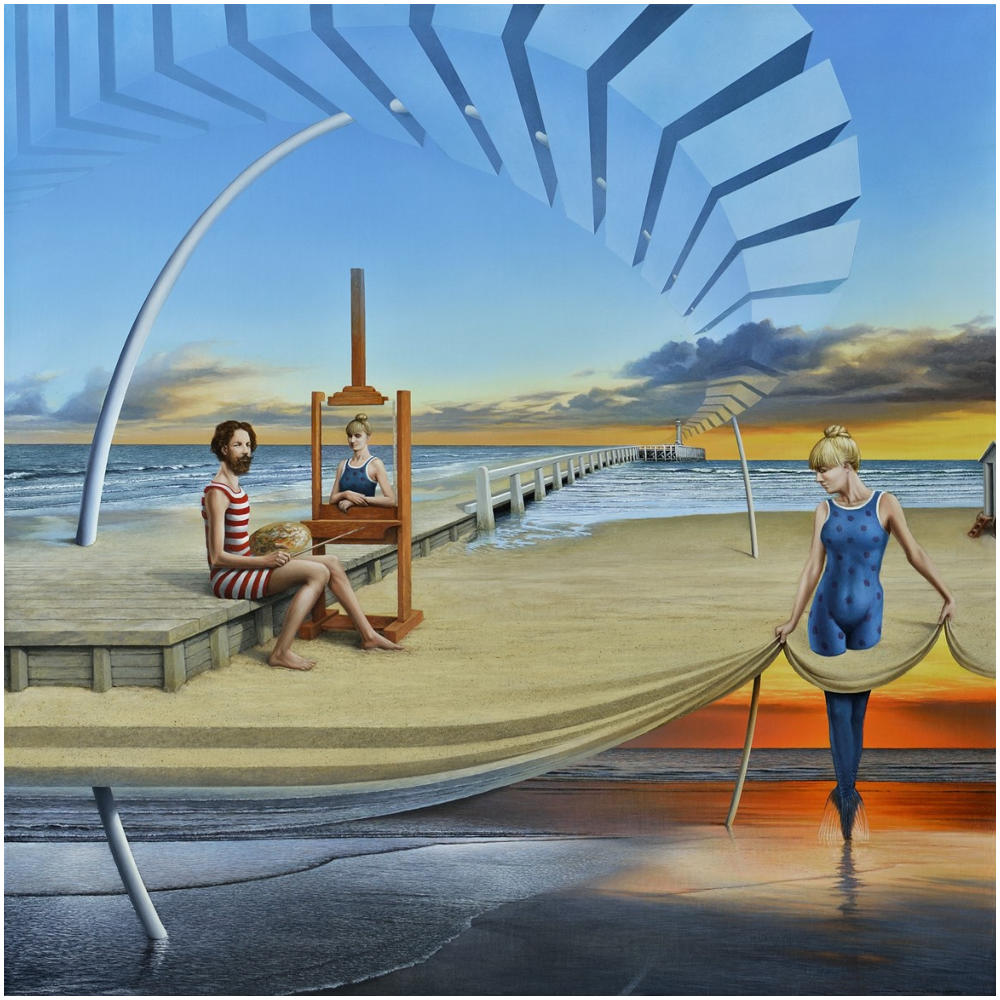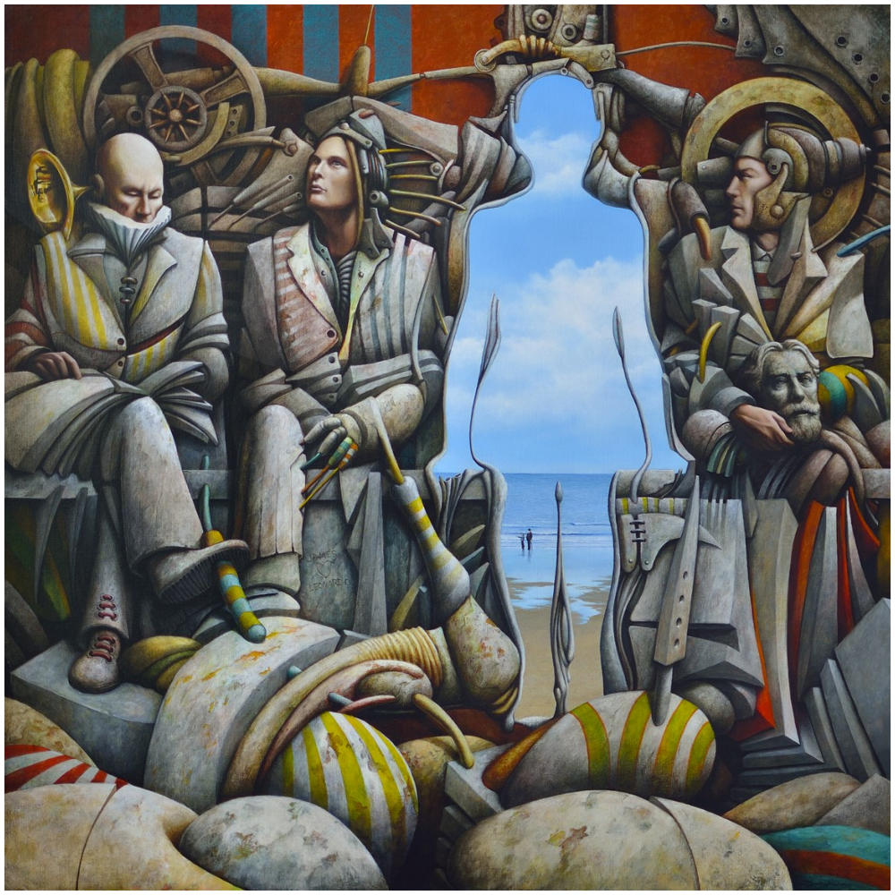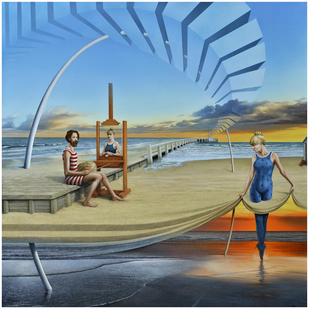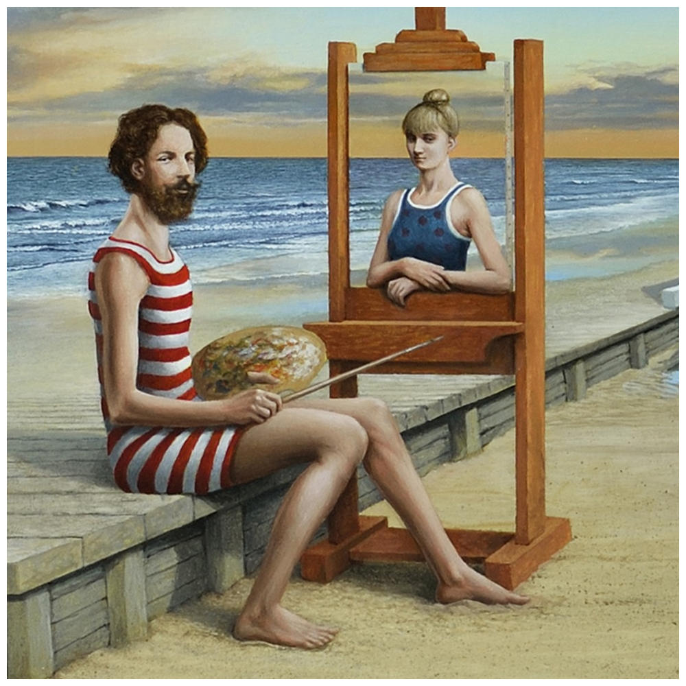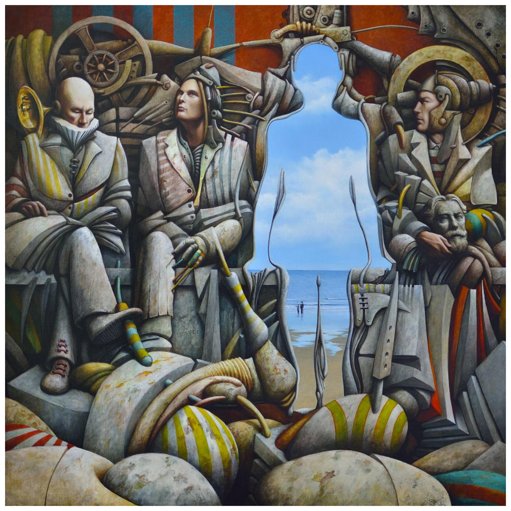 Acryl op doek 202280 x 80 cm nspiratiebronnen: ‘L'Appel de la sirène’ een schilderij van James Ensor . Gesigneerd 1891.Het schilderij lijkt een parodie te zijnop JanVan Beers fotogravure ‘Zeebaden te Oostende’1888