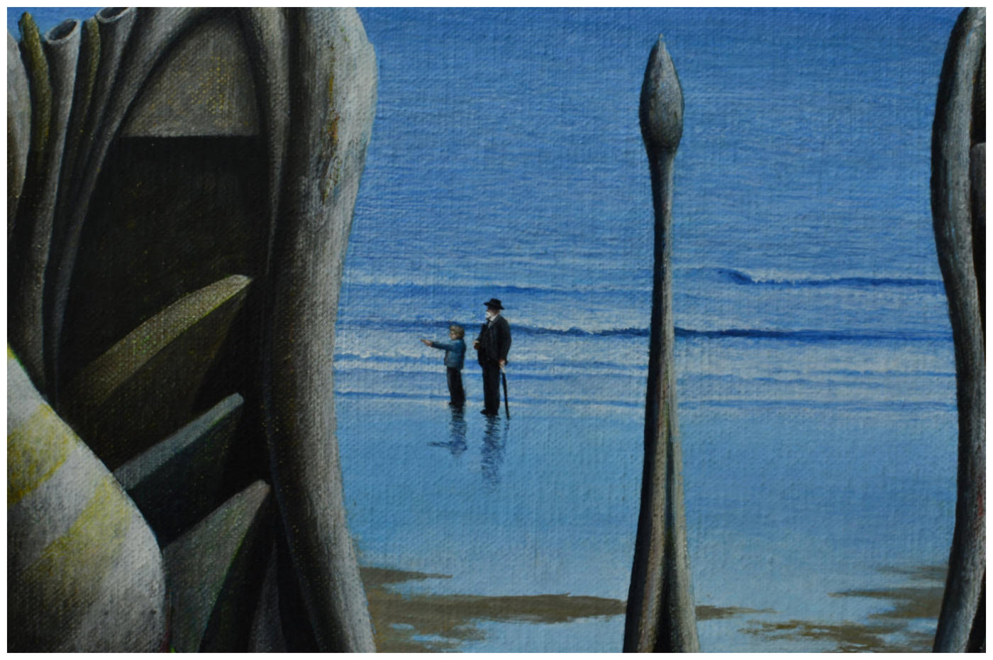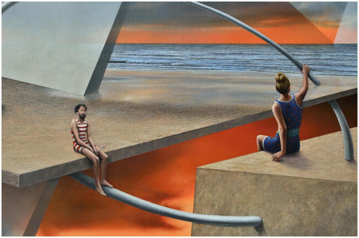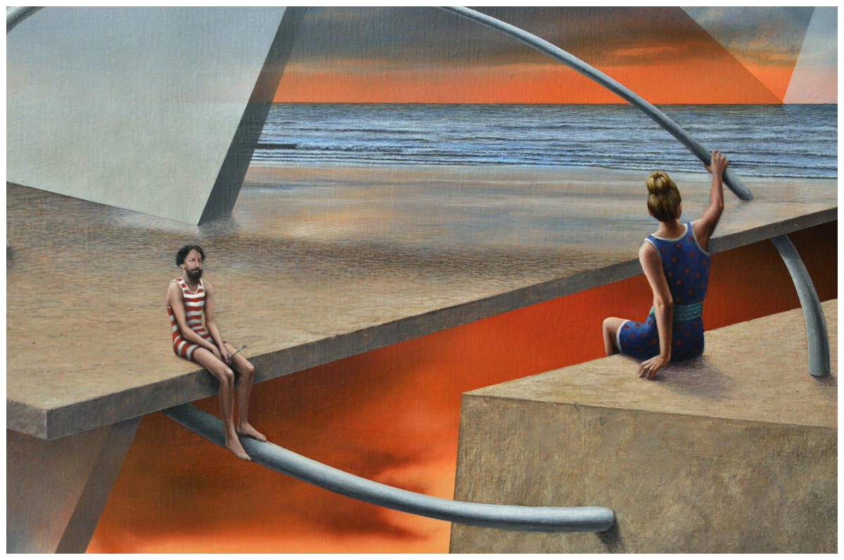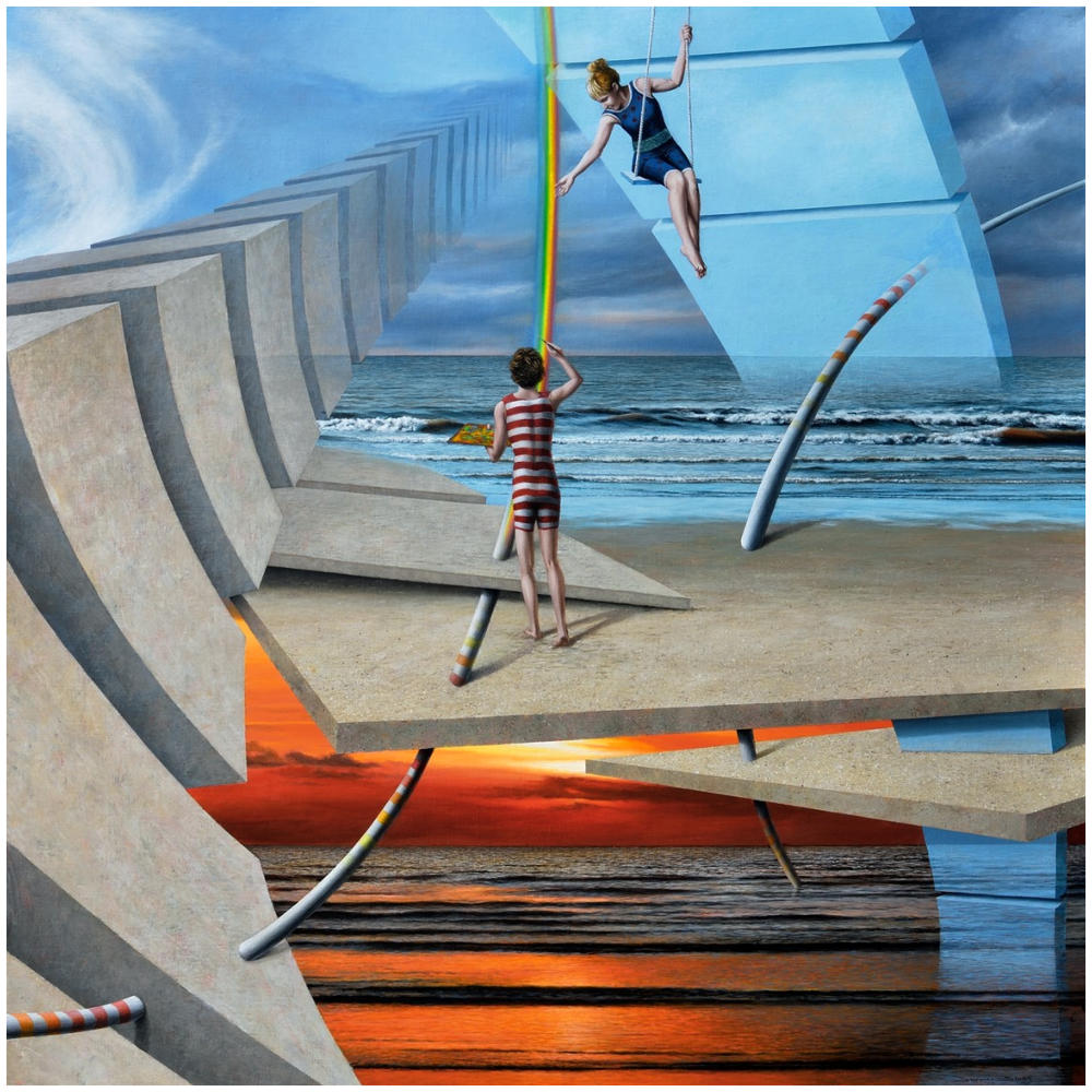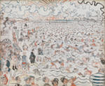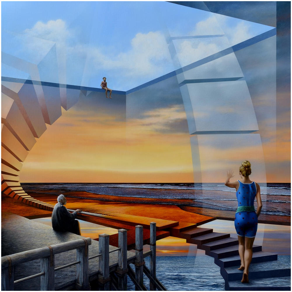 Acryl op doek 202280 x 80 cm nspiratiebronnen: ‘L'Appel de la sirène’ een schilderij van James Ensor . Gesigneerd 1891.Het schilderij lijkt een parodie te zijnop JanVan Beers fotogravure ‘Zeebaden te Oostende’1888