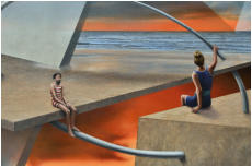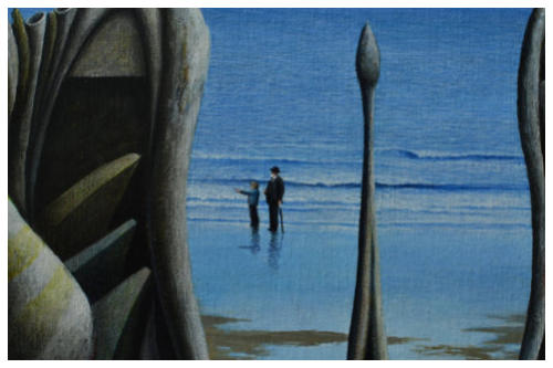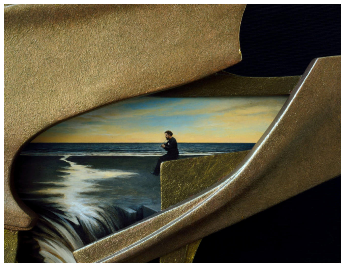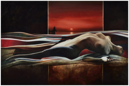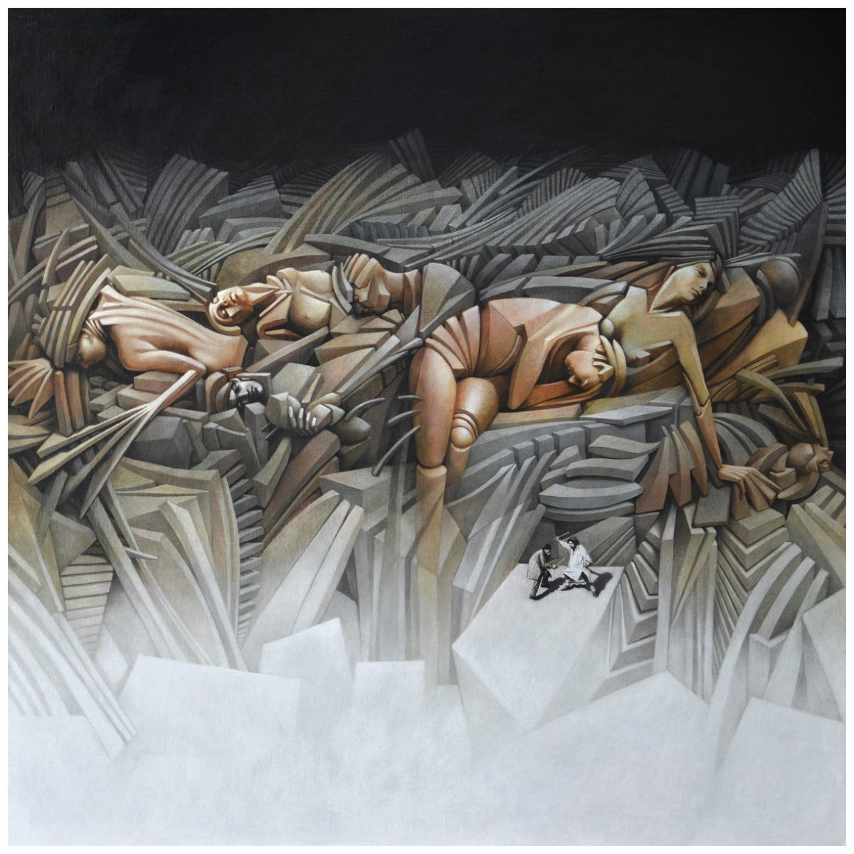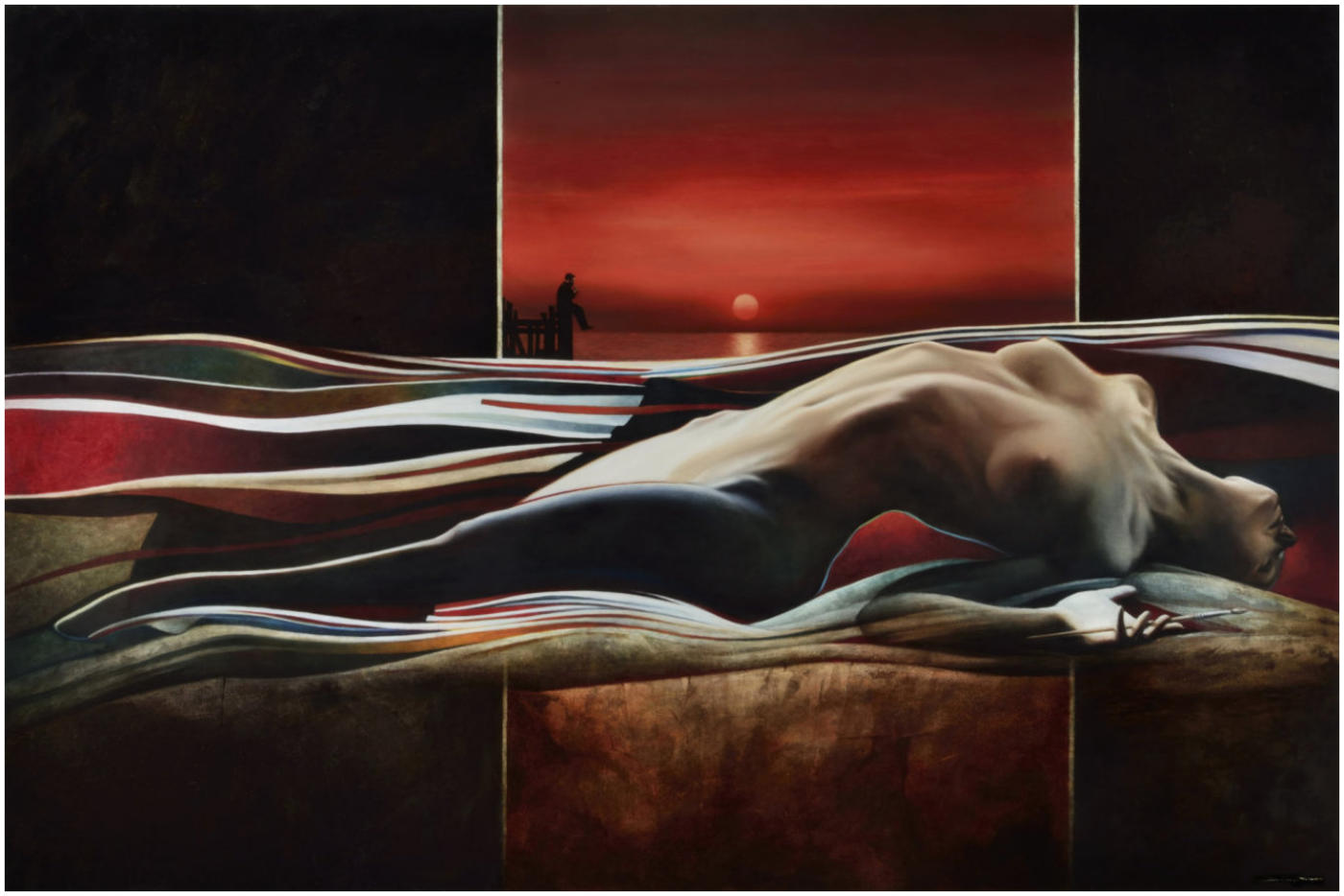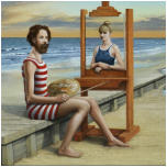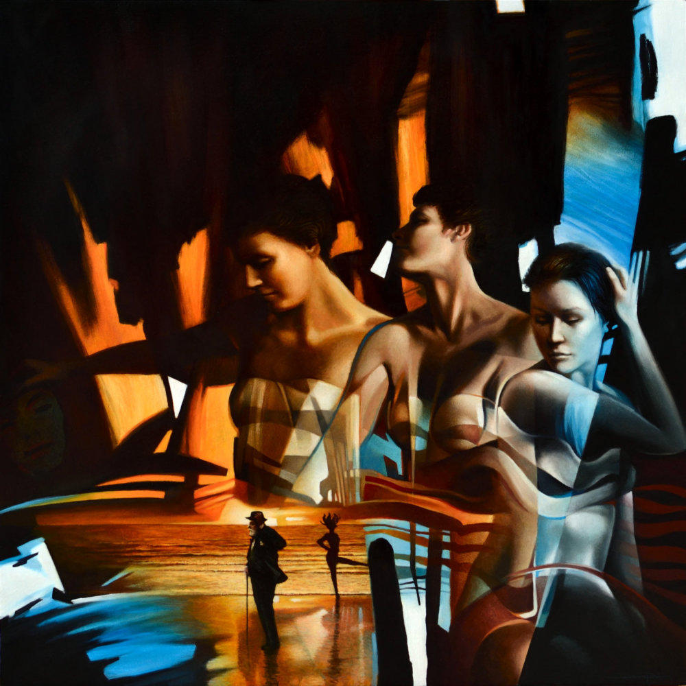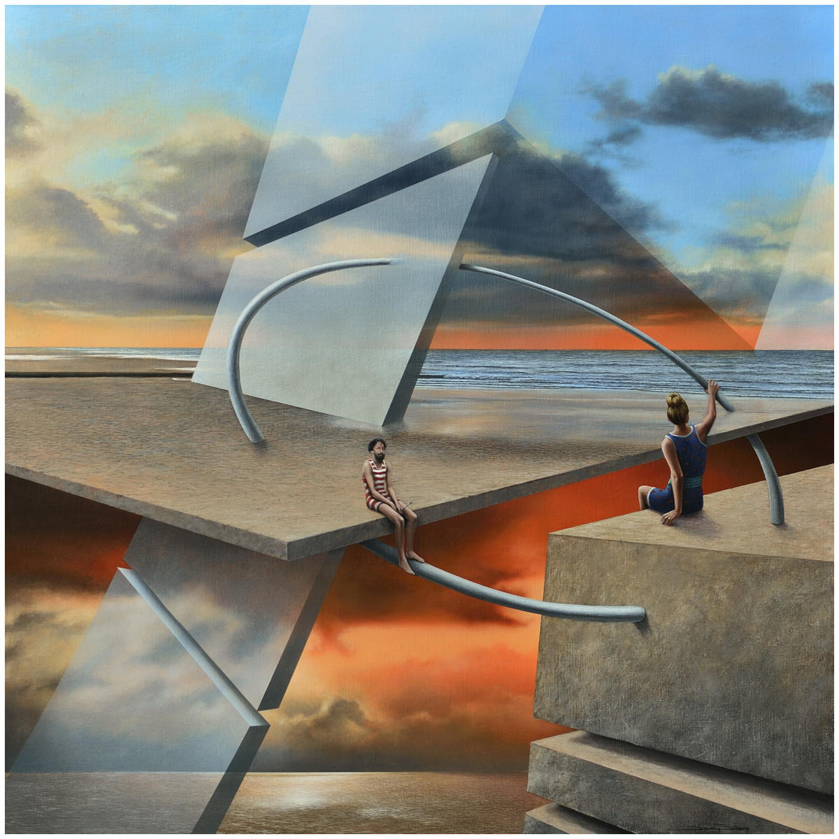 Acryl op doek 202280 x 80 cm nspiratiebronnen: ‘L'Appel de la sirène’ een schilderij van James Ensor . Gesigneerd 1891.Het schilderij lijkt een parodie te zijnop JanVan Beers fotogravure ‘Zeebaden te Oostende’1888