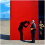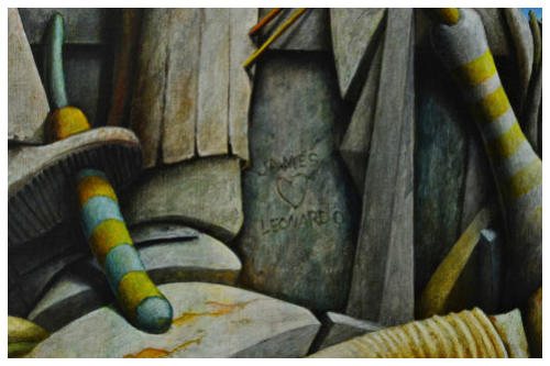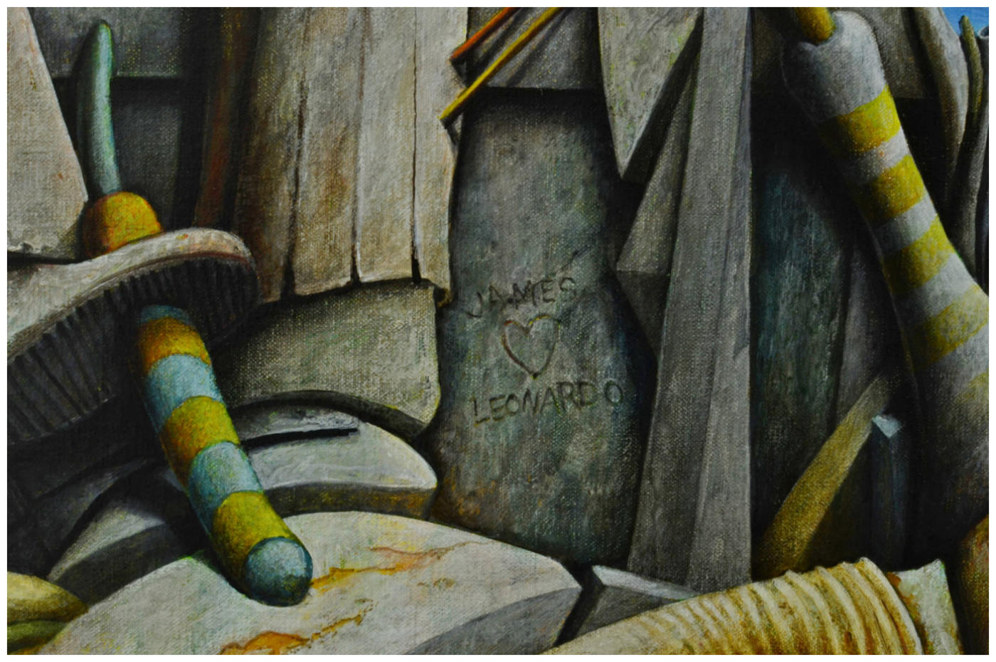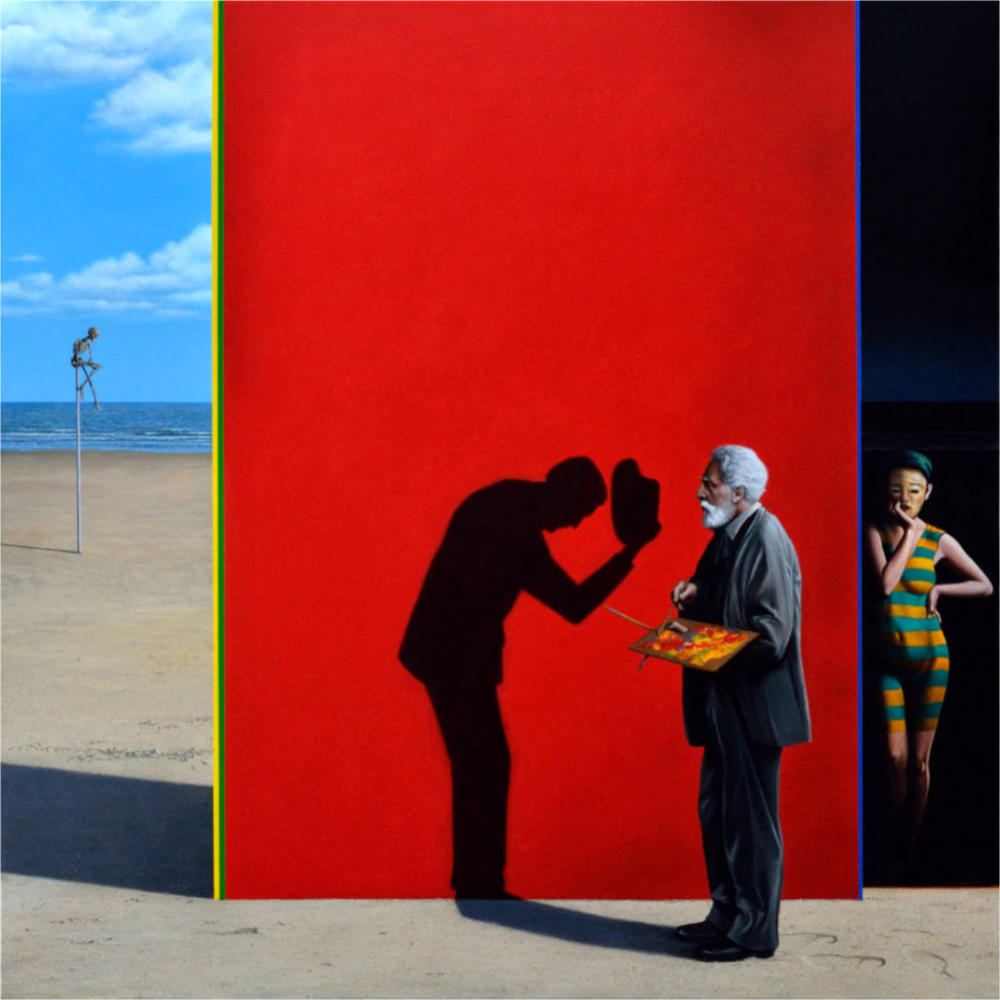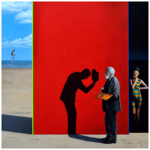 Jaarlijks organiseert de culturele vereniging OOkunst vzw uit Kortemark een kunstroute. https://www.oo-kunst.be/index.htmVoor een fil rouge project kunnen de deelnemende kunstenaars een kunstwerk creëren rond een bepaald thema. Hieraan wordt een publieksprijs gekoppeld. Tijdens de editie van 2016 was het thema van de fil rouge ‘Hoed af voor kunst’. Op basis van dit thema is de compositie ontstaan.De iconografische elementen in de compositie zijn ingegeven door persoonlijke overdenkingen maar zijn niet vaststaand en mogen door de beschouwer vrij geïnterpreteerd worden.Het idee om de schaduw van een kunstenaar zijn hoed te laten afnemen voor die kunstenaar kan geassocieerd met worden met Ensors identiteits- problematiek, zelfbeeld en zelfrepresentatie. De zee als decor lijkt vanzelfsprekend. Oostende, de stad aan zee, en James Ensor zijn onlosmakelijk met elkaar verbonden. Het rode schilderij waar Ensor voor staat refereert naar Barnett Newmans Who’s Afraid of Red Yellows and Blue III - 1967-68 (Stedelijk Museum Amsterdam) (1). Door de opkomst van o.a. het abstract expressionisme en de Cobrabeweging, en ook met de rebelse tijdgeest waarbij de figuratieve schilderkunst als ouderwets werd gezien nam de artistieke belangstelling voor het magisch realisme van de technisch virtuoze Nederlandse schilder Karel Willink af. Hij ging in de tegenaanval met zijn boek ‚De schilderkunst in een kritiek stadium’ (1950), waarin hij de experimentele schilderkunst bekritiseerde. De Amsterdammer Gerard Jan van Bladeren, een onbekende realistische kunstenaar, raakt ergens in 1986 bezeten door de teksten van Willink. Van Bladeren ziet abstractie in de kunst als 'een plaag'. De miskende kunstenaar heeft hevige angstaanvallen en is paranoïde. Hij raakt er steeds meer van overtuigd dat er iets gedaan moet worden tegen de plaag van abstractie die de kunst in zijn greep houdt. Op een ochtend op 21 maart vertrekt Van Bladeren naar het Stedelijk Museum. Met een stanleymes snijdt Van Bladeren vier lange horizontale en vier verticale incisies in het 13 vierkante meter grote doek. Hij is totaal in de war en beschouwt het toegetakelde schilderij van Newman als een meesterwerk.Toen Les Vingt in 1886 het net nieuwe schilderij ‘Zondagmiddag op het eiland van La Grande Jatte’ van Georges Seurat exposeerde, het paradepaardje van de nieuwe stijl van het pointillisme, was het voornamelijk Ensor die zich afzette tegen de nieuwe stijl. James Ensor wordt nu erkent als pionier van de moderne kunst.Typerend voor veel van Ensors kleurcomposities is de dominantie van rood, geel, blauw en groen. (2)Op de verdwaalpaal zit een skelet. In de ets ‘Mijn portret in 1960’ (1988) probeerde Ensor zich een voorstelling te maken hoe hij er als honderdjarige zal uitzien. (3)Op het bekende werk 'De Baden van Oostende’ zijn baders te zien in gestreepte badpakken. (4)De baadster die voor een nachtelijke achtergrond staat houdt een masker voor die overgenomen is van James Ensors schilderij ‘Stilleven in het atelier’ 1889 , Neue Pinakotek München. (5)De kleuren van het badpak zijn niet conform met de toen gangbare mode.